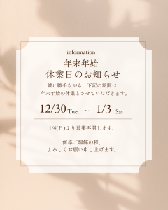 年明けは1月4日(日)より通常営業となりますので、来年も引き続きどうぞ宜しくお願いいたします。